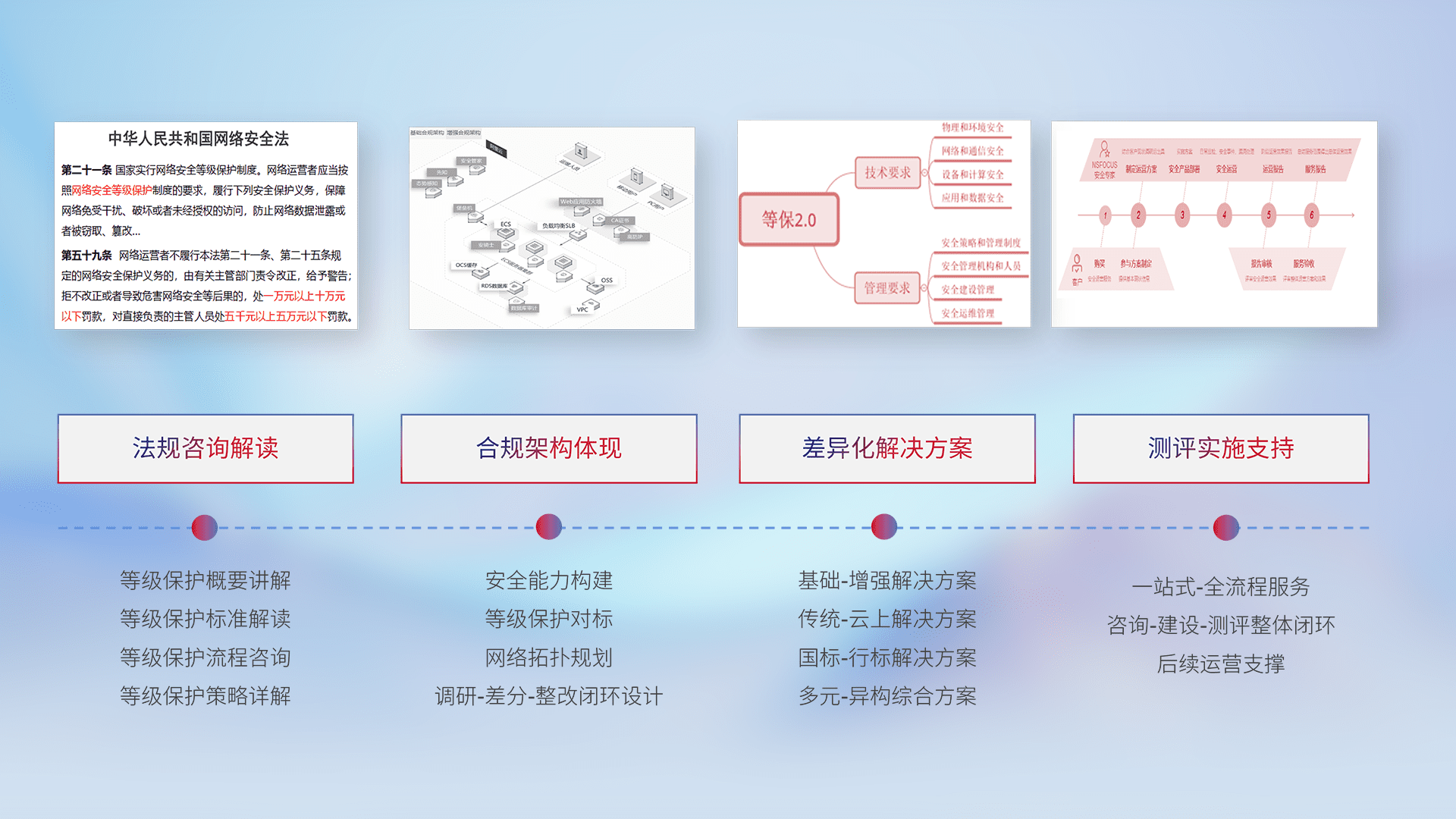 通过专业的法律咨询解读、、、、合规架构体现、、、差异化解决方案、、测试实施支持等服务,,,,为客户量身打造等保合规体系。。。。