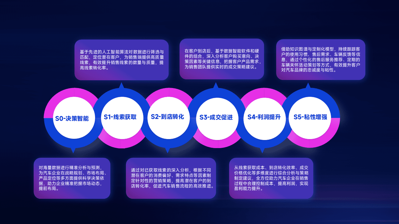 通过拓宽潜在客户来源、、优化线索分配并提高到店转化率,,以增强销售效率。。。同时,,,,利用线索数据不断优化分析模型,,有效提升转化率,,,扩大营销影响力。。。。